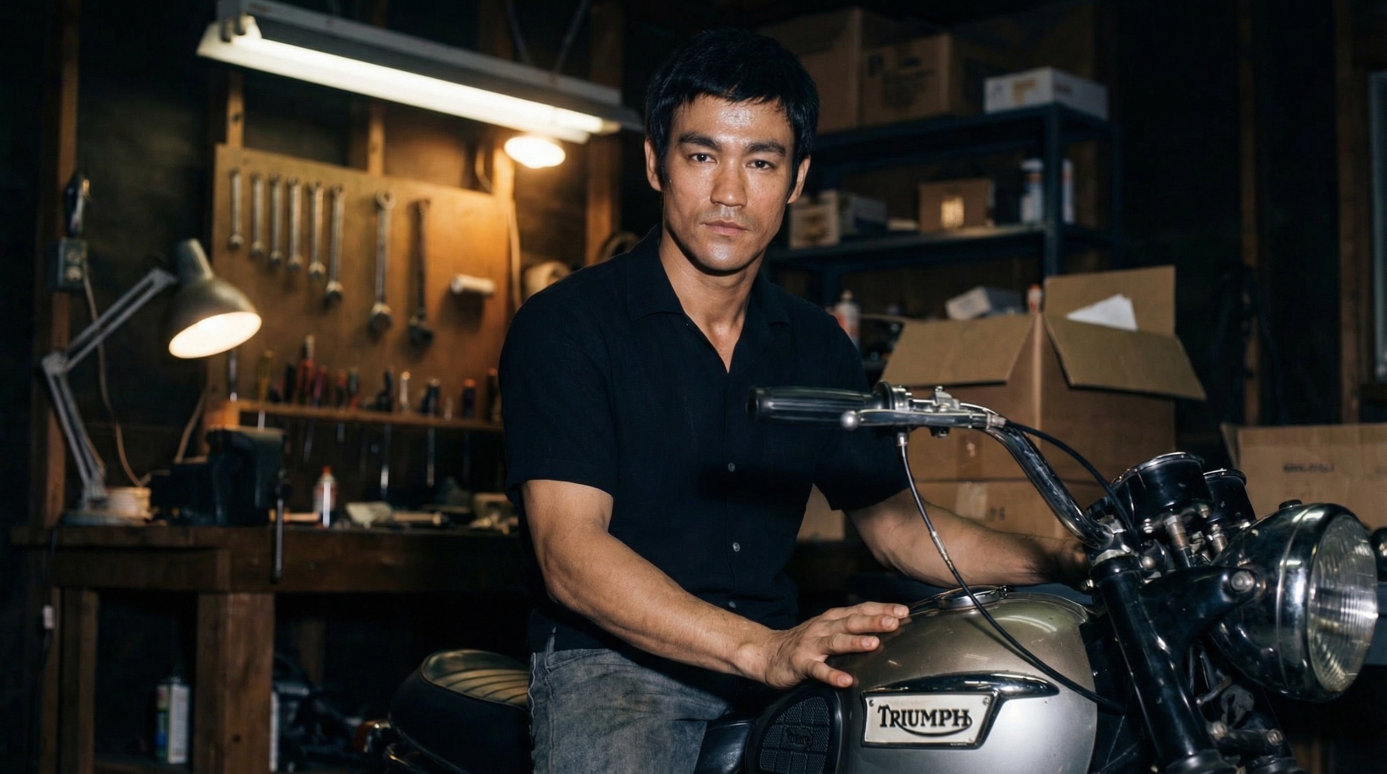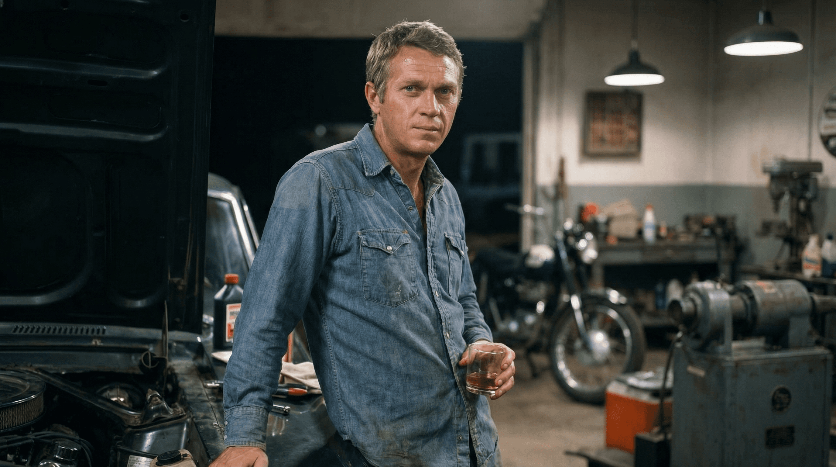 In the garage at Steve McQueen’s Hollywood Hills home, friends gathered to talk about fast cars, loud bikes, movies, and fame. They’re legends here, but tonight no one pretends to be a star.